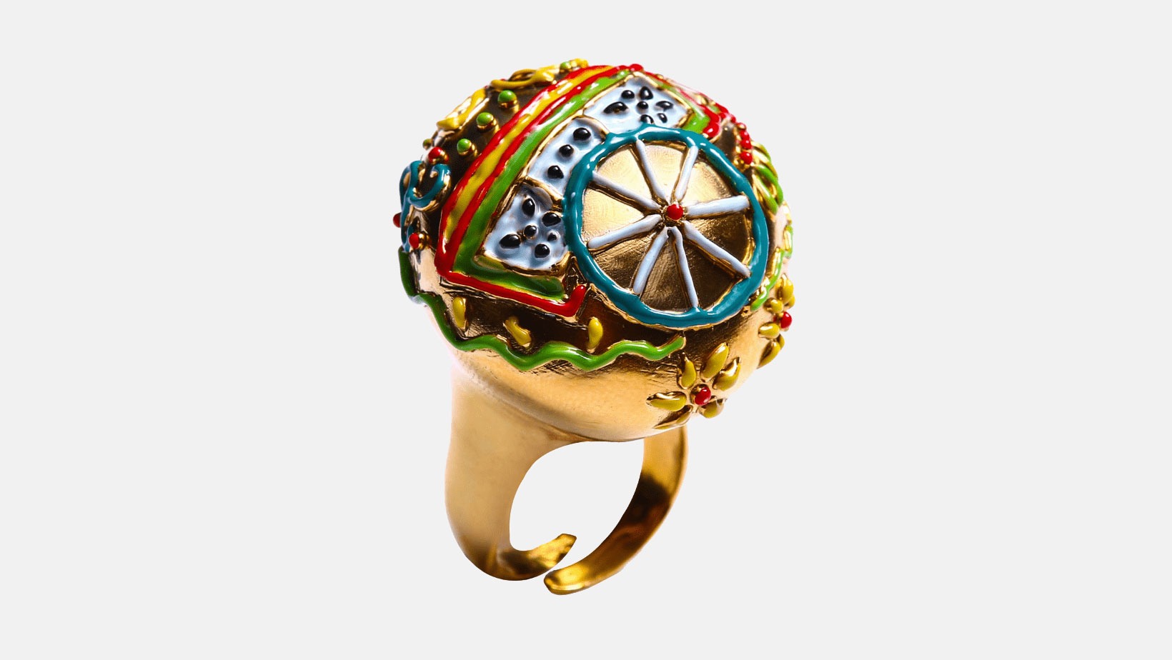 La collezione consta di cinque anelli e riflette pensieri gonfi e storie variopinte della Sicilia. Dai fichi d’india ai carretti, passando per volti cromaticamente coinvolgenti: ogni anello è distintivo di un concetto differente, con punto di partenza comune la cultura mediterranea. Il gonfio, piccolo mondo antico e allo stesso tempo contemporaneo, è una vera e propria esercitazione di stile: la bellezza sta nell’equilibrio tra la rotondità, sinuosa e femminile, e la farcitura disegnata con maestria.